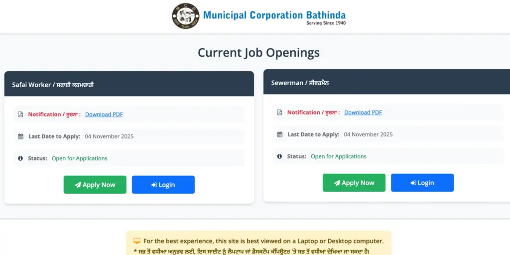 The Bathinda Municipal Corporation has issued a recruitment announcement. The recruitment process includes two main positions for Safai Sevak and Sewerman roles which accept applications from both male and female candidates.