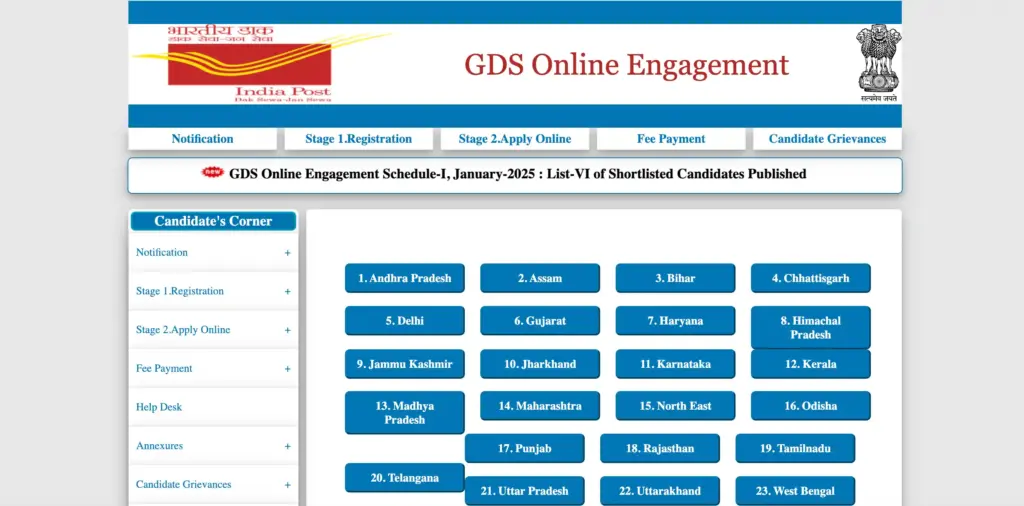 The application process exists exclusively through the internet. The official website of India Post GDS at https://indiapostgdsonline.gov.in requires your visit.